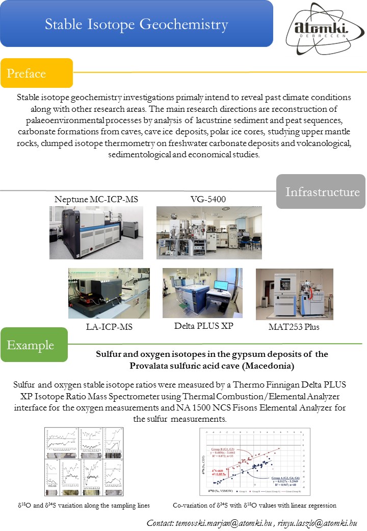 Stable isotope geochemistry investigations primaly intend to reveal past climate conditions along with other research areas. The main research directions are reconstruction of palaeoenvironmental processes by analysis of lacustrine sediment and peat sequences, carbonate formations from caves, cave ice deposits, polar ice cores, studying upper mantle rocks, clumped isotope thermometry on freshwater carbonate deposits and volcanological, sedimentological and economical studies.
